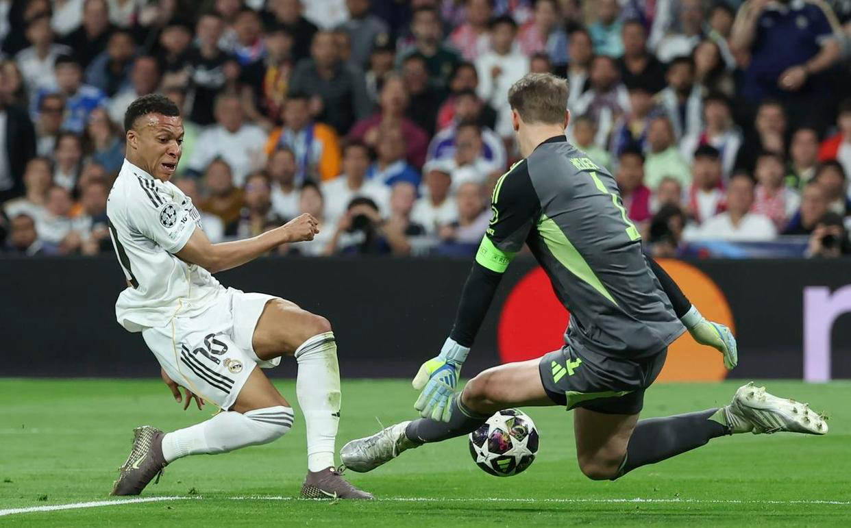 正当现场的皇马球迷准备庆祝时,诺伊尔展现了作为顶尖门将的卓越素养。他凭借准确的预判提前做好位置调整,在姆巴佩射门的那一刹那,身体猛烈发力,伸展手臂侧扑。最终,他指尖轻触皮球,将这一必进之球生生挡出底线,化解了这次致命危机。